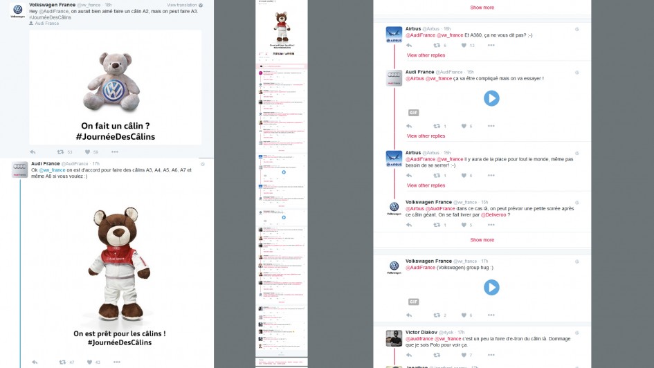 Quand un tweet d’un constructeur posté (par le community manager @VW_France) mentionne un autre constructeur @Audi (via le community manager) alors là pour cette #JournéeDesCâlins #NationalHugDay lors du 21 janvier 2016, après c’est parti en freestyle ! Même @Airbus a atterri dans la conversation !